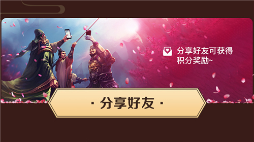人世间真情难能可贵,从小耳濡目染的患难见真情无疑是三国时期的“桃园三结义”,正所谓有福同享有难同当,有了好玩的游戏自然要和朋友们分享啦!点击活动页面——分享好友,将消息分享给同爱玩游戏的那个TA,就可以获得积分哦!和好友一起攒积分、兑奖励,共享人世繁华!
