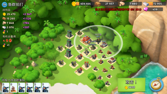 1野人,炸掉两个大加,右侧登陆,震爆打掉右侧4个防御,引导打掉左侧防御,再安心推本