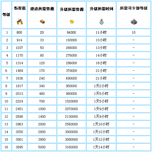 高爆地雷升级、建造时间详细数据: