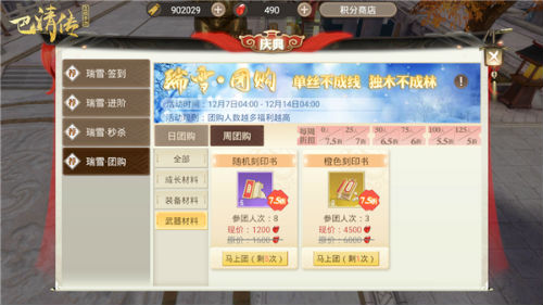 在双12期间,我们还将开启“瑞雪·团购”活动。在活动期间,玩家可以在团购界面,团购自己所需的道具,参与团购的人越多,所获得的折扣越高。当团购人数达到125人时,可以用极为优惠的折扣价格兑换高级橙色刻印、龙渊宝鉴等珍稀道具!