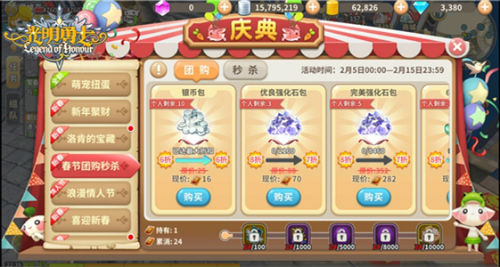 活动期间,萌主大人可通过参与新春聚财活动获取团购券。在团购秒杀活动中,玩家可以使用团购券兑换折扣道具,所有团购道具都有限购次数,并且限购类型被分为全服限购、单人本次限购两种,尽最大的限度地保证了每位玩家都能够兑换到自己心仪的道具。当全服购买某个道具的总数量达到指定数量即可获得更加优惠的折扣。同时,单人本次限购次数也将重新刷新。