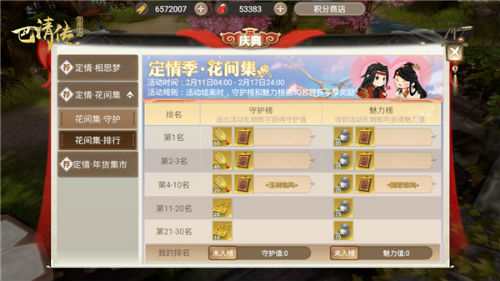 在定情花间集界面,玩家点击“我的排名”即可跳转排行榜,查看详细的排行情况哦。