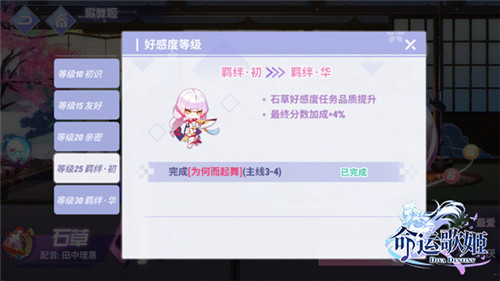 好感度也是羁绊中不可或缺的一环。想要提升歌舞姬的好感度,送礼物就是最直接的方式了。随着好感度的增加,歌舞姬的态度也会逐渐发生改变。从冷淡到亲密,进而结下越来越深刻的羁绊,每突破一个阶段后,歌舞姬的触摸反馈和交互语音都会有所不同。与此同时,好感度越高的歌舞姬,在演出中获得的分数加成也会越高哦!