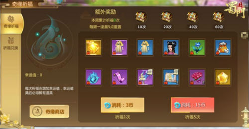 蜀友们使用祈福玉可以进行祈福,化腐朽为神奇,每次祈福都必定可以获得奖励,有机会获得永久时装金风细雨、和永久挂机金风醉!每周累计祈福满指定次数,还可以额外获得宝箱奖励!从宝箱中可以获得捆仙锁、神罚令、灵力、绑银等奖励。