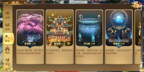 《蜀门手游》帮会等级破封在即,将开放帮会各个建筑的等级上限至6级!帮会等级的提升离不开每一位一同建设帮会的小伙伴们,齐心协力将再创帮会新高!当建筑等级到达6级,相应的效果与增益也将得到相应的提升:天元鼎,提升每次捐献所获取的帮会贡献;仙灵阁,增加帮会商店的商品种类,同时还将增加限购物品的数量;剑仙石,提升完成剑仙石帮会任务所获取的奖励;观星台,可以获取更高品阶的装备;灵宝阁,提升帮会拍卖行流拍物品的回收价格;藏宝楼,增加全新的每周帮会福利,全新帮会秘宝争夺开启!