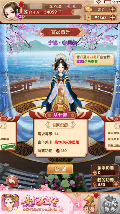 宫中妃嫔也和朝臣一样有着森严的等级制度,需要通过层层考核来提升官品。“晋升”功能不仅对玩家的等级有严格规定,对主线剧情的进度也有一定的要求,各品级的考官娘娘们更是使出浑身解数阻拦玩家的晋升。