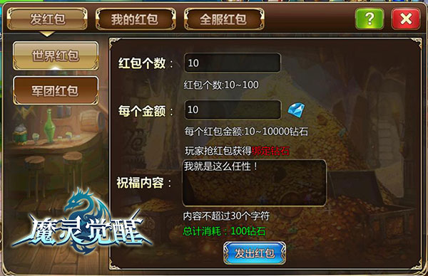 在《魔灵觉醒》中,想要发红包的土豪英雄们在创建红包成功后,就可以向当前所有在线的玩家或同军团玩家发送红包信息了,收到红包信息的英雄则需要手动点击红包图标抢红包。无论是热闹的婚礼现场还是祥和的平时,哪怕是在野外PK英雄们都可以向服务器所有在线玩家发送红包,世界红包和军团红包,想发哪儿发哪儿!拼人品靠运气的时刻即将来临!