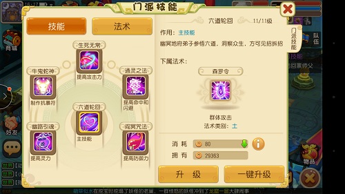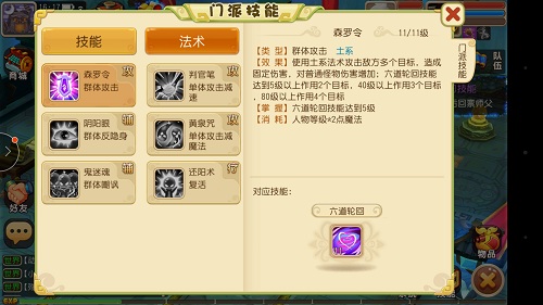 森罗令:土系群伤,判官笔:单攻,可减速敌方;阴阳眼:附加洞察状态;黄泉咒:夜间伤害增加,减敌方魔法;鬼迷魂:几率迷魂,持续伤害且几率嘲讽;还阳术:复活,且增加攻击但防御减少。