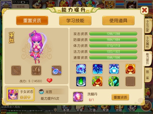 子女成年之后可以进行能力上的提升了,对于资质不太满意的成年子女可以使用洗髓丹可进行资质上的突破。子女升级可获得潜力点,不同发展方向的子女选择加点方式不同,即使对于加点有需要改动的时候也可以花费铜币进行洗点操作。装备上,子女可佩戴宠物装备和护符以及子女专属的饰品。