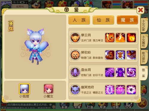 子女可选择的门派由子女种族决定,可选门派对应种族的规则和玩家选择门派是一致的。