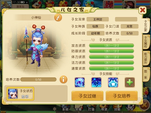拜师学艺之后,子女便开始进入幼年期。学艺有成,方能陪同父母作战,所以要想子女能够帮助战斗,首先需要把子女养育成人。