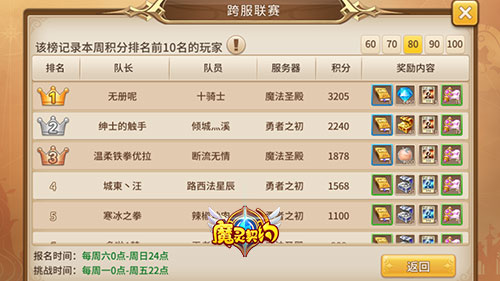 据悉,每周六0点-周日22点是《魔灵契约》跨服联赛的报名时间,达到60级以上的玩家可与好友组队前往报名,在这期间玩家可重组队伍或调整阵容重新报名;每周一0点-周五22点则是参赛时间,在这期间玩家每天可对5个对手进行挑战,挑战成功即可获得200积分,不过下一个对手的能力会大幅度提升;若挑战失败,则当天无法继续挑战,且扣除当天获得积分的50%……(更多详情请移步游戏内)