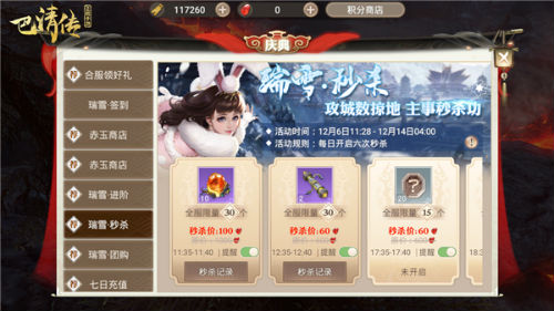 在双12期间,我们将开启“瑞雪·秒杀”活动。在限定时间内,各位主事大人可以用超值折扣的价格,兑换到橙色刻印书、龙渊宝鉴、宝石等珍稀道具!不过,我们的这些珍稀道具是有数量限制的哟!先到先得,机会难得!