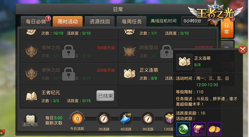 好了,关于正义连萌的玩法就先介绍到这里了。如果大家刚刚刷完副本,记得留意一下时间哦!正义联萌玩法等你来体验,并且还有神海激战、神殿对决的那个创新玩法等你来战!赶紧前往3K游戏《王者之光》战个痛快吧!